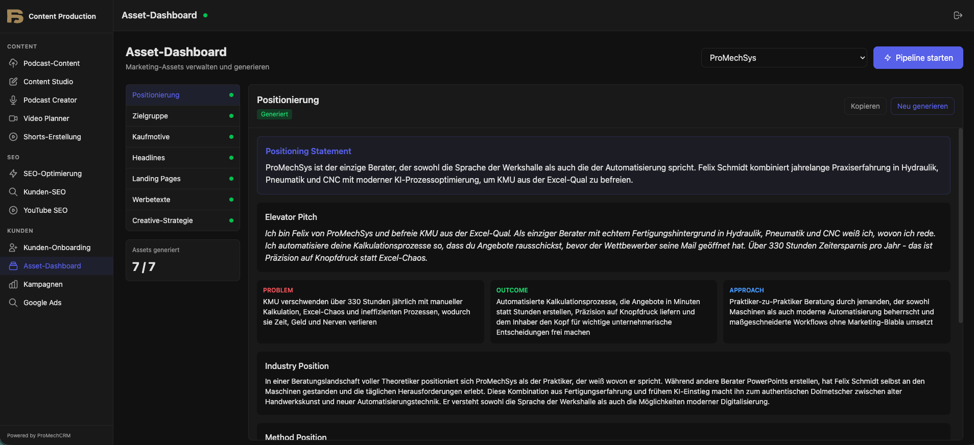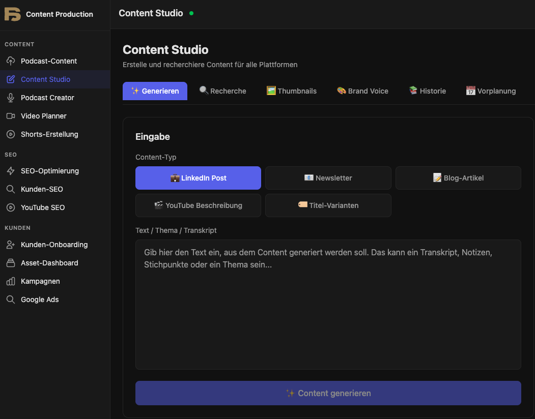 - Content Studio: Recherche (YouTube via Google API, Perplexity-API), Beiträge für LinkedIn, Newsletter, Blog und YouTube-Titel/Beschreibungen.